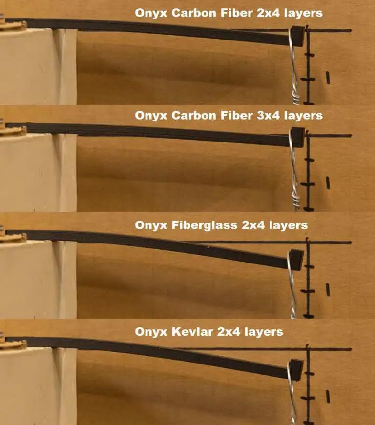 正如你从照片中看到的(垂直偏差标记以英寸为单位),使用纤维增强的部分更加坚硬。纤维增强打印有两到三组增强层(顶部和底部),每组只有四层。由此,可以推断出添加更多的纤维会让部件变得更硬。并且碳纤维的抗弯强度要超过了铝6061。